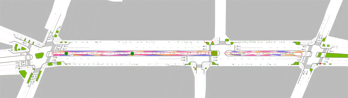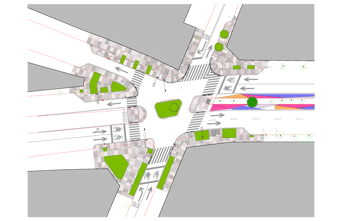 La intervención redefine la infraestructura peatonal con ajustes geométricos que garantizan seguridad y accesibilidad, optimizando la relación entre peatón y vialidad. Se reconfiguran cruces seguros y se mejoran banquetas, eliminando interferencias y asegurando visibilidad en intersecciones clave.