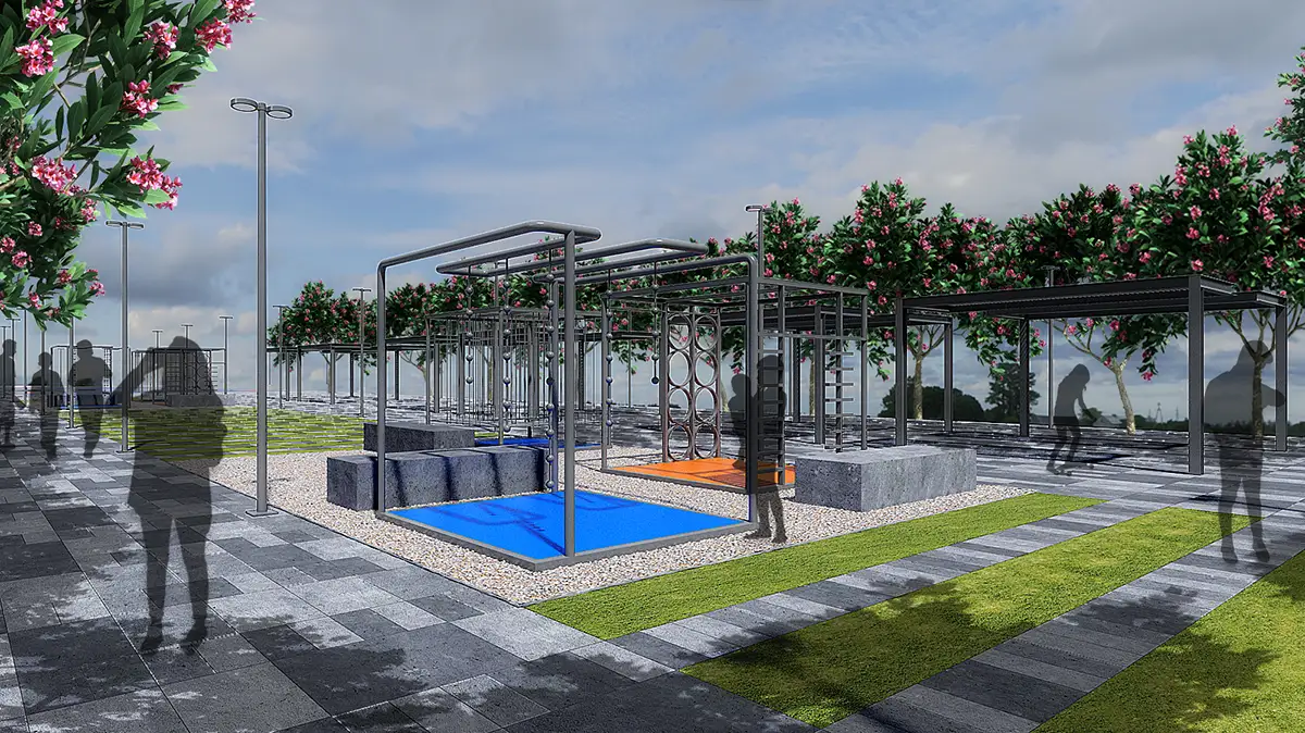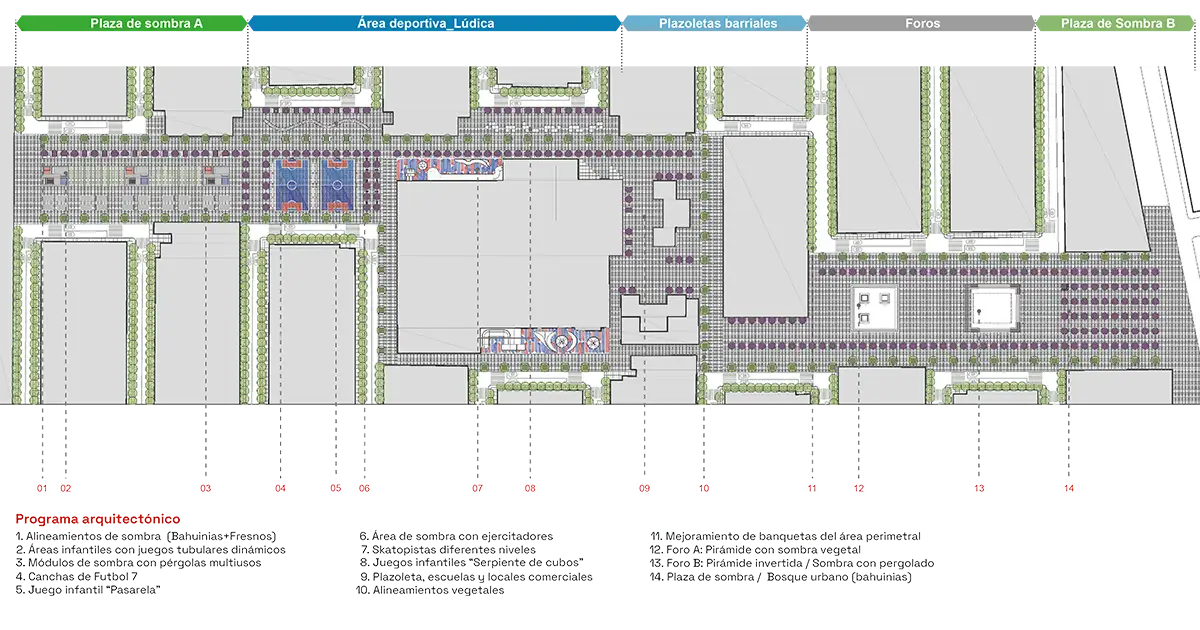 El eje recreativo integra canchas de fútbol, skatopistas y juegos infantiles, promoviendo la apropiación del espacio. Foros abiertos y estructuras pergoladas refuerzan el vínculo entre arquitectura y comunidad. Más que una intervención física, el proyecto democratiza el diseño y resignifica el espacio público como un punto de encuentro urbano.