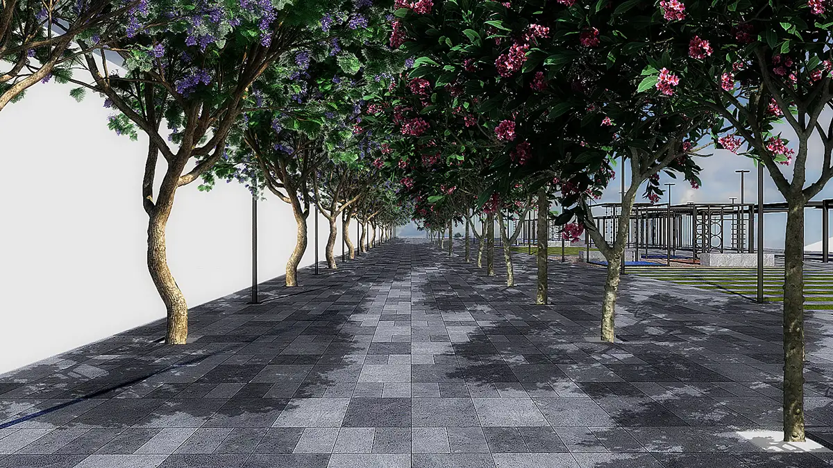 La rehabilitación de los espacios residuales en Calle 2 Crescencio Torres busca transformar el territorio en un lugar de integración social, movilidad activa y permanencia. La estrategia de diseño incorpora módulos multiusos, plazoletas y alineamientos de sombra, conectando escuelas y comercios para fortalecer la cohesión barrial.